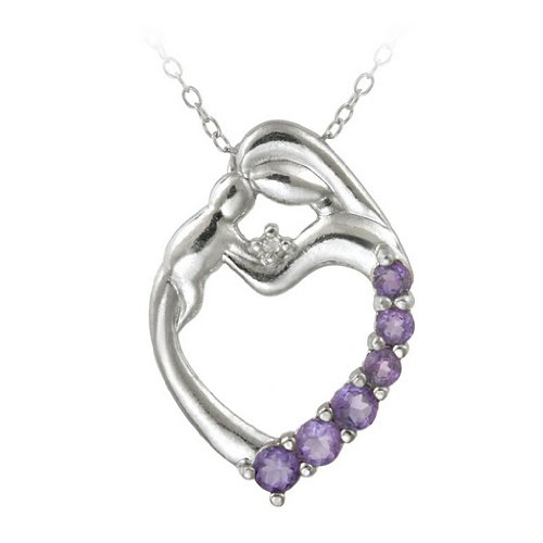 Sterling Silver Amethyst, This lovely pendant features a mother holding a baby on the top of a polished open heart. There are graduating round amethyst stones alongside its border and a single genuine diamond set on the top. The pendant dangles from an 18-inch rolo chain and is crafted of sterling silver. Total gem weight is .46ct and total diamond weight is .01ct.