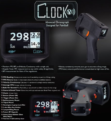 The Virtue ClockTM is the most advanced chronograph in the world, designed specifically for the sport of paintball. With a solid glass-filled nylon construction, ergonomic design and intuitive operation, the Clock is the ultimate chronograph in paintball. The Clock is designed from the perspective of a player, tournament or field operator; to make administering games more smoothly and allow players to maximize the performance of their equipment. Record Multiple Shots for Peak FPS & BPS No more "one balling" over the Chrono. Simply fire a burst of 3, 5, or more shots over the Clock and it will read them all and automatically display the peak FPS and BPS. This feature can dramatically decrease chrono time, and tells the player and ref exactly what they need to know in a single glance. Scrollable FPS & BPS History After firing a burst of shots over the Clock, it will display peak FPS & BPS, but the entire string (up to 15 shots) is recorded in scrollable memory. Simply tap the rear button to scroll thru and see the FPS and BPS for each of the shots (BPS of each of the last 2 shots). Maximize Performance with Consistency +/- FPS Data The Clock will automatically calculate and display the +/- consistency of your string and tell you how consistent your velocity is, as well as report the average FPS. Consistency is an important factor in determining your gun's accuracy, especially at long range. The better the consistency (lower +/-) the tighter your shot grouping can be. Manage Games More Effectively Read more customer reviews ...